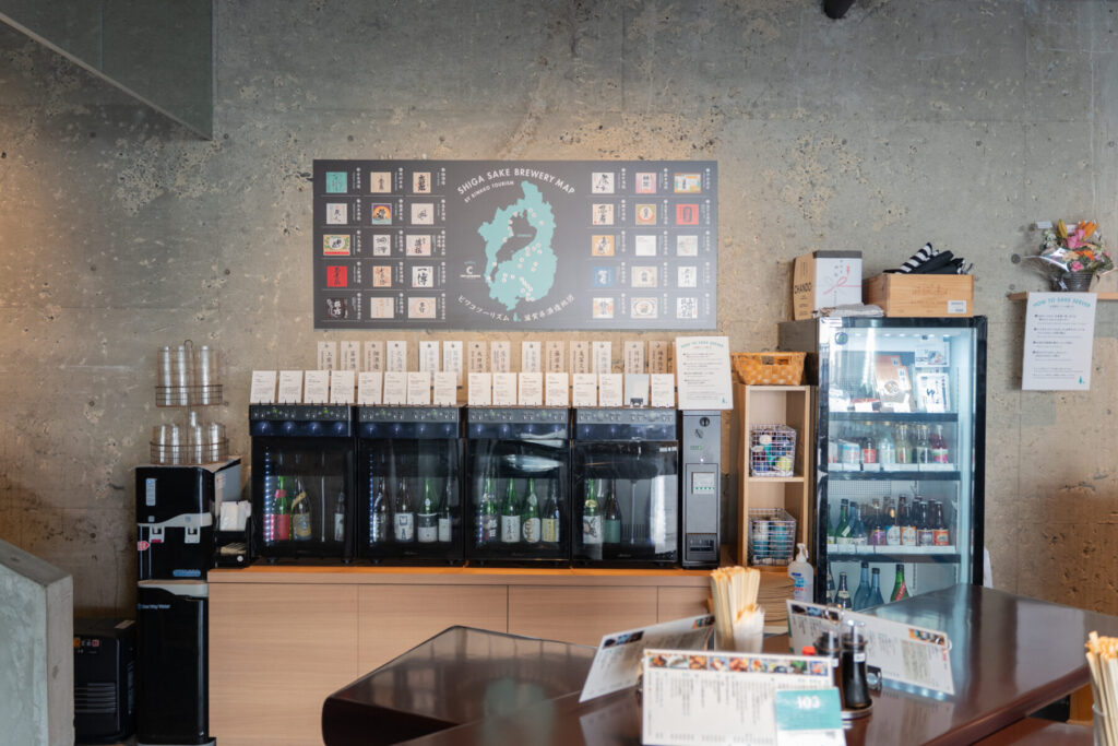コイン式の酒サーバーが並び、近江しゃも、鮒ずし、赤こんにゃく地元食材を使ったおつまみとのペアリングも楽しめます。