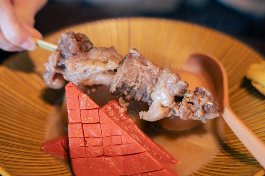 器を覗くと、牛すじ・大根・玉子・赤こんにゃくといった定番の具材が並びますが、ひとくち食べて驚きました。