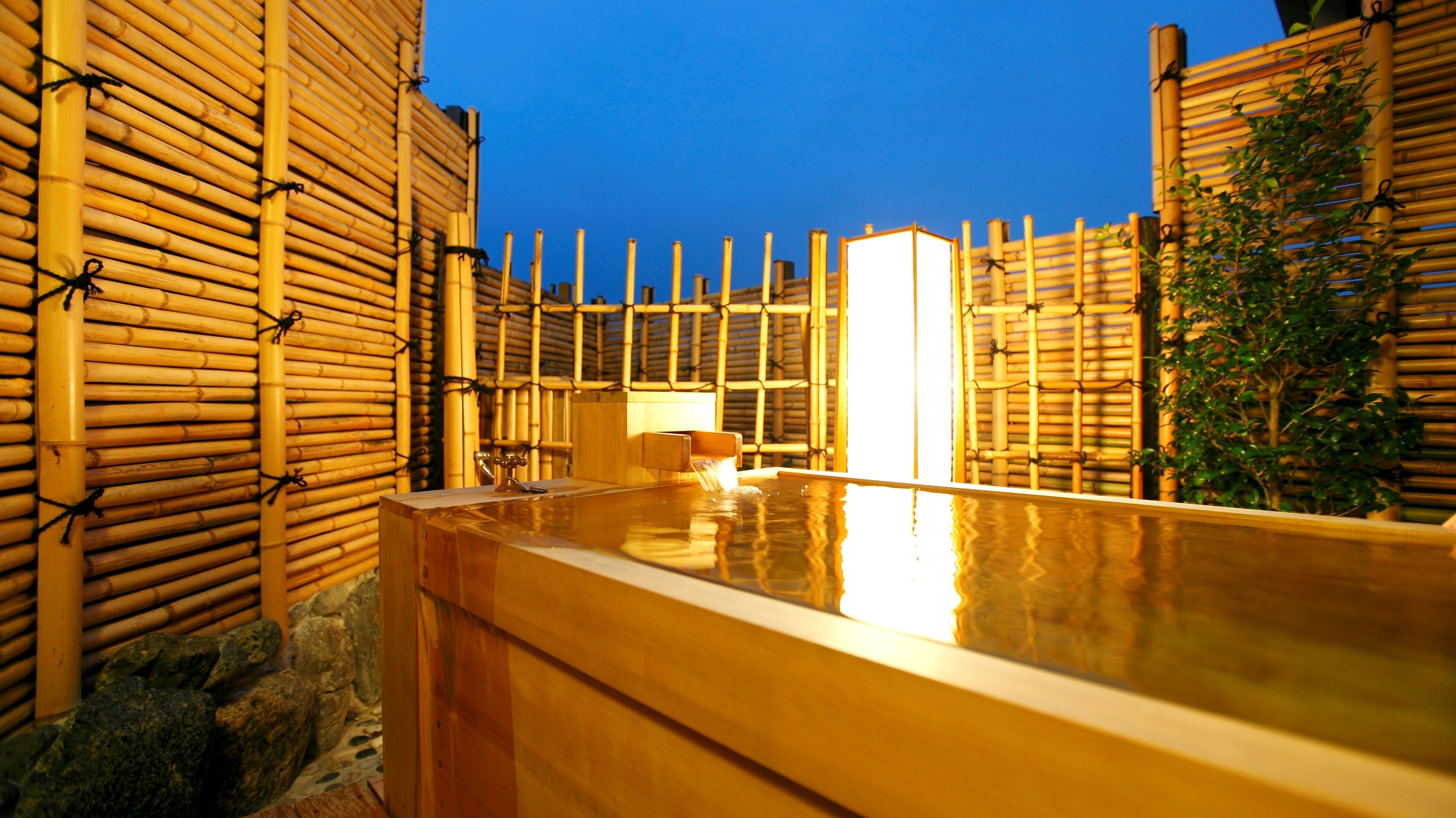 露天風呂付和洋室は、お部屋に露天風呂、桧風呂の浴槽にまわりは竹垣で囲まれ、素敵なお部屋です。