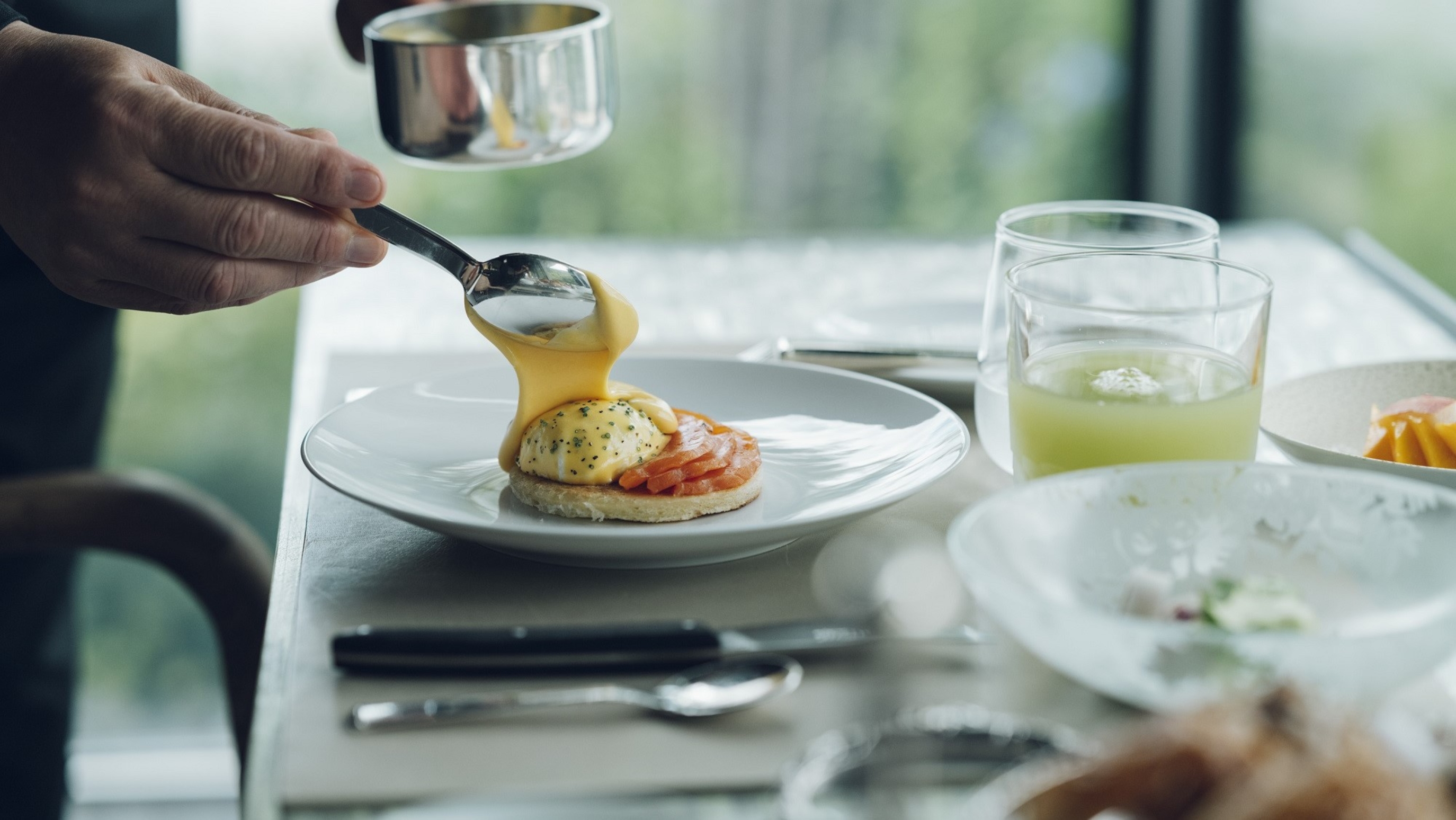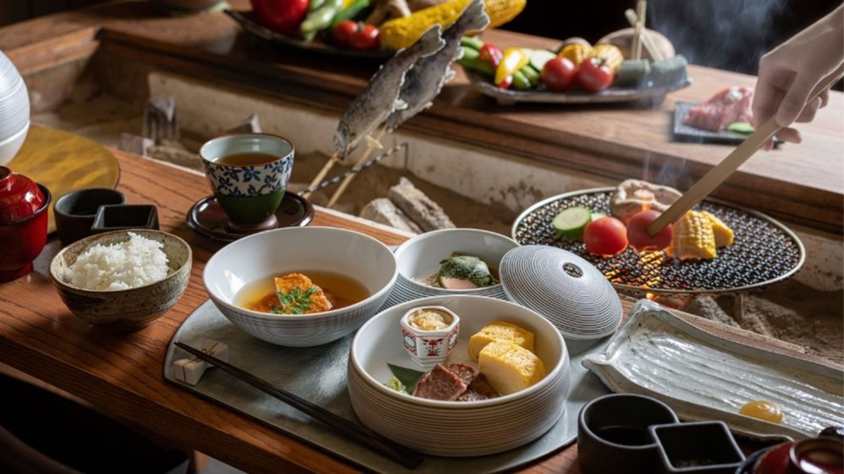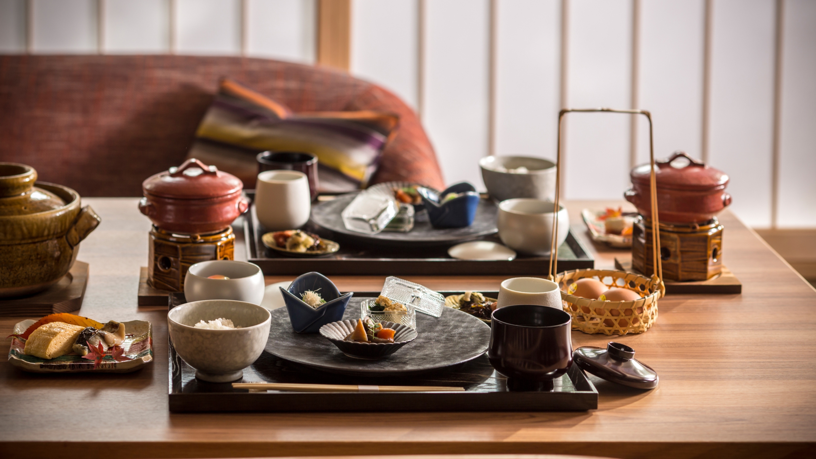 朝は和⾷・洋⾷・養⽣朝⾷からセレクト。和食は土鍋で焚き上げた京都産のお米と卵掛けご飯をメインに、旬の魚とお野菜のおかず。