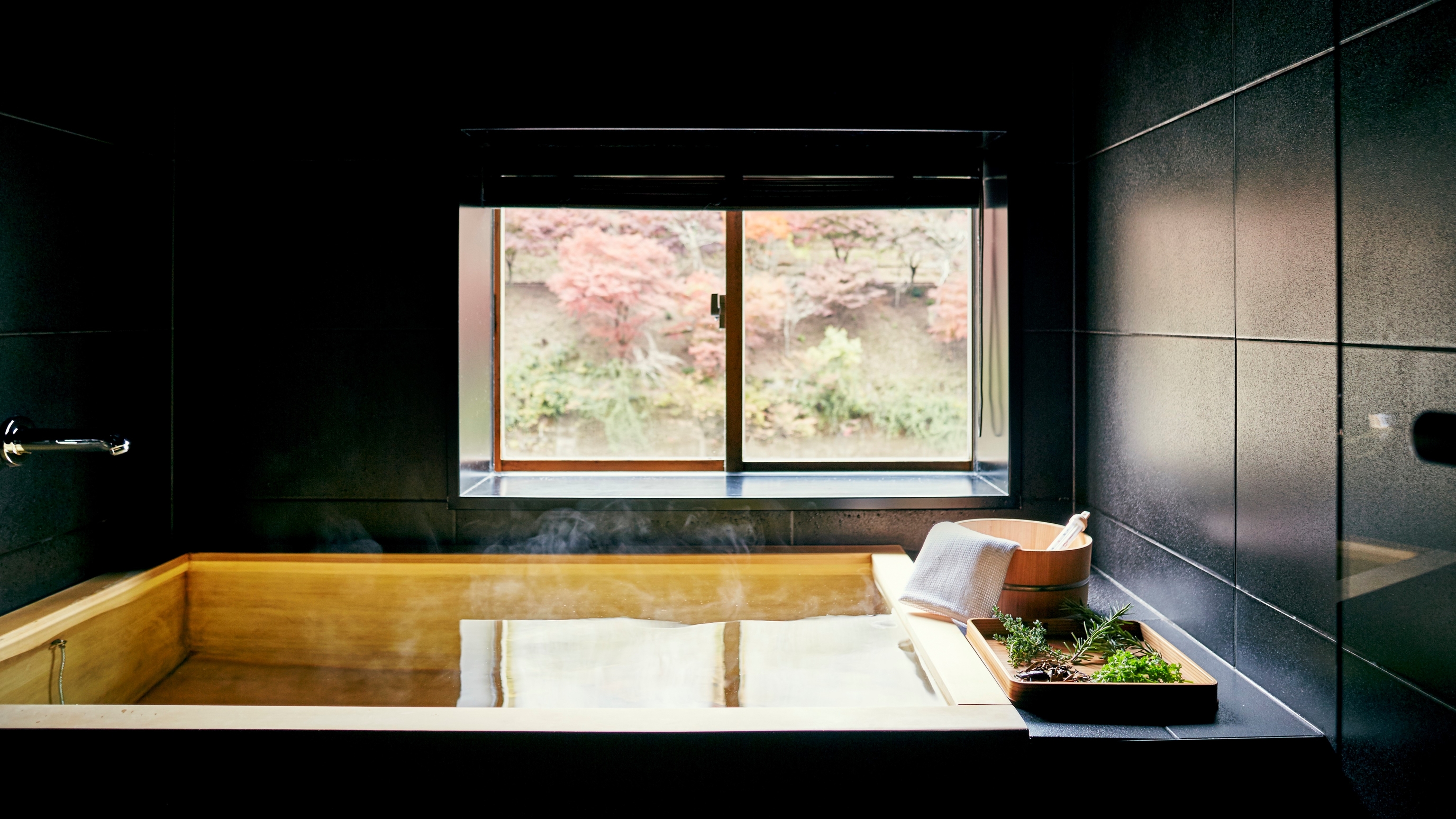 客室の浴槽は、温かみのある木製で窓も大きく、外の木々や桂川を眺めながら入浴できそう。