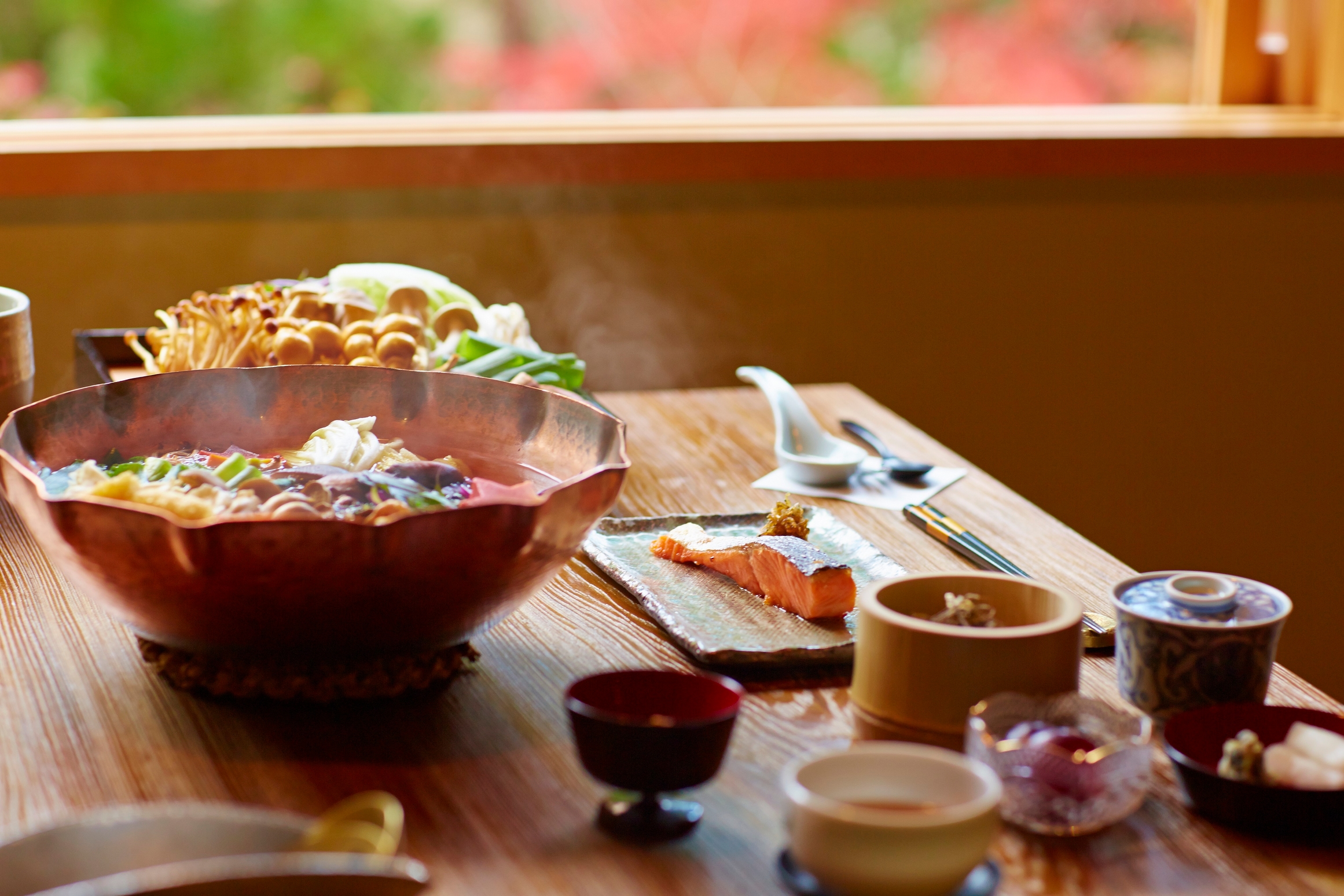 朝食は旬野菜の鍋料理、優しいお出汁を朝の景色とともに味わえます。