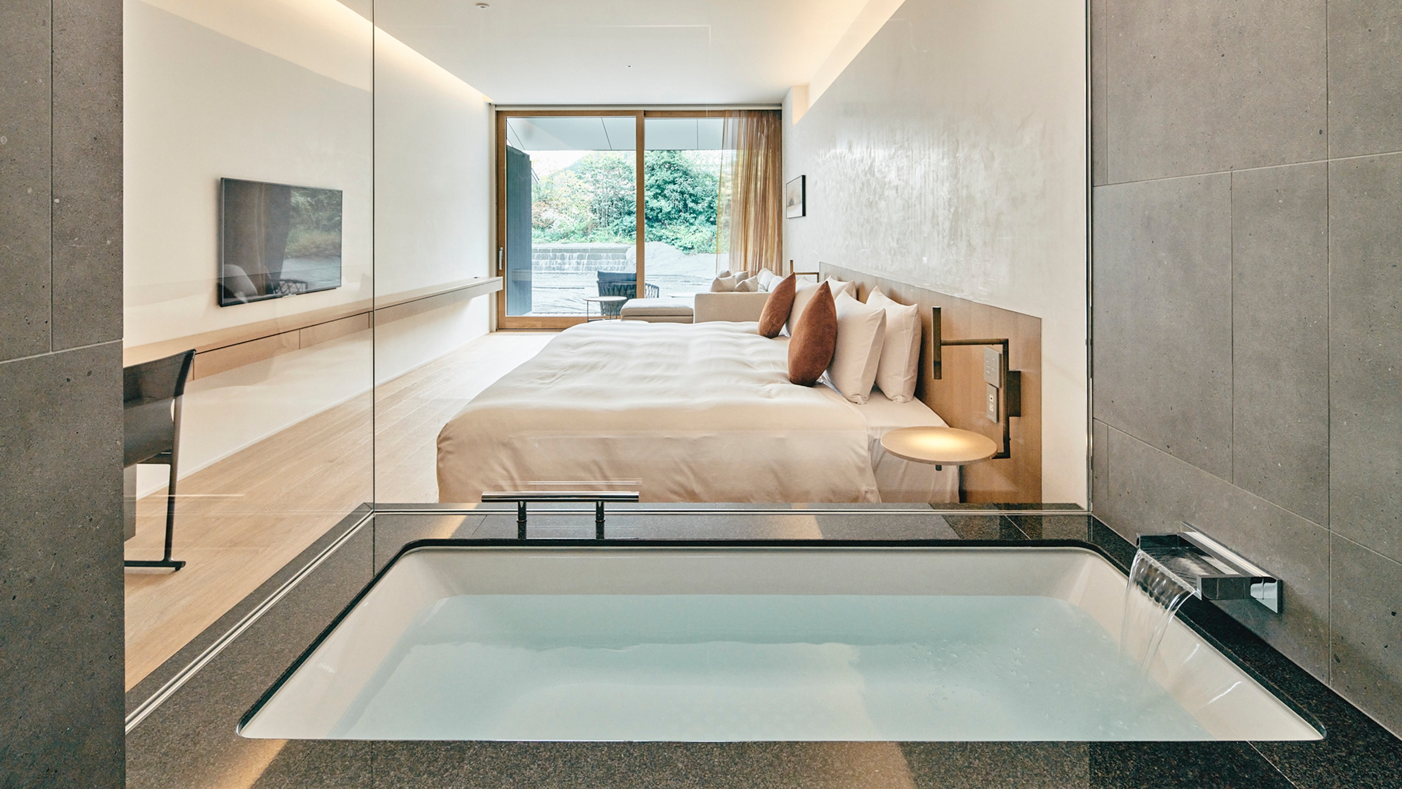 スタンダードタイプとスーペリアタイプの客室は主にガラス張りのバスルーム、お庭や景色を浴室から望めるタイプもあります。
