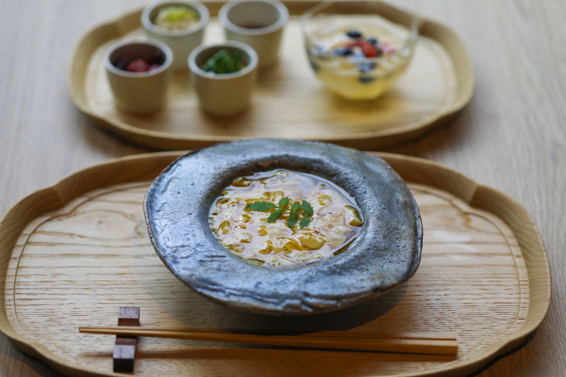 養生朝食は湯葉と柚⼦のあんをかけたおかゆに、陰陽五行をイメージした5色の副菜。