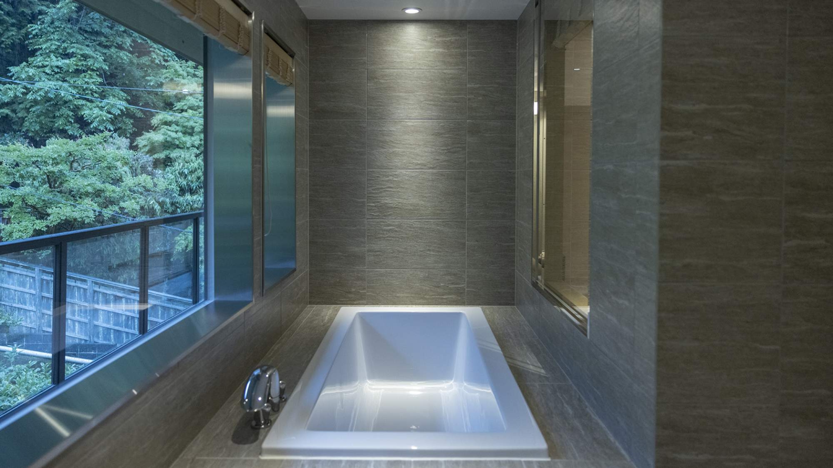 無双窓のある半露天風呂、オープンエア青石和風呂付など多彩な客室風呂があります。