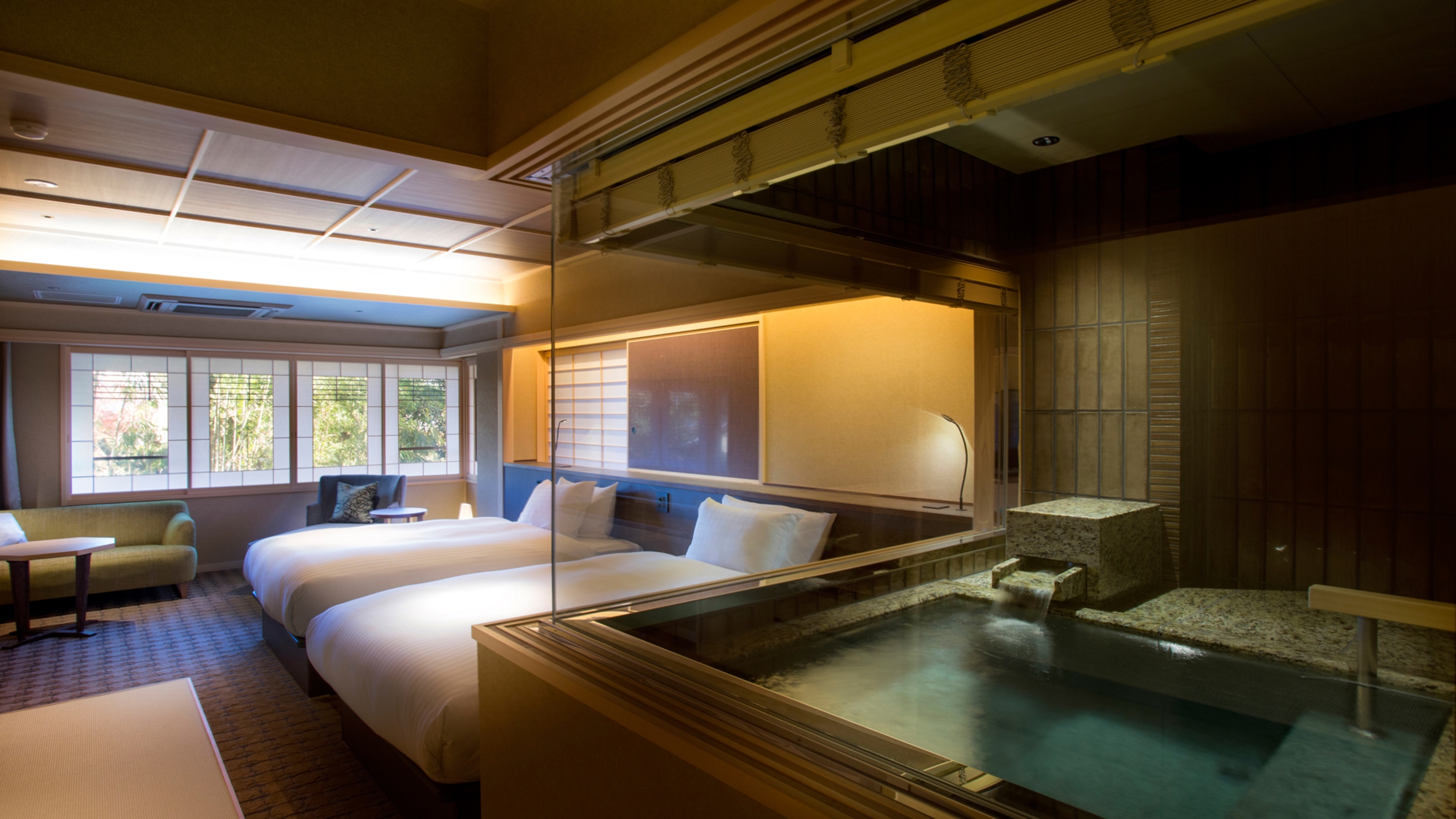 露天風呂付テラスを備えた客室、寺社のような坪庭付、ゆとりある内風呂を配した客室などバリエーション豊か。