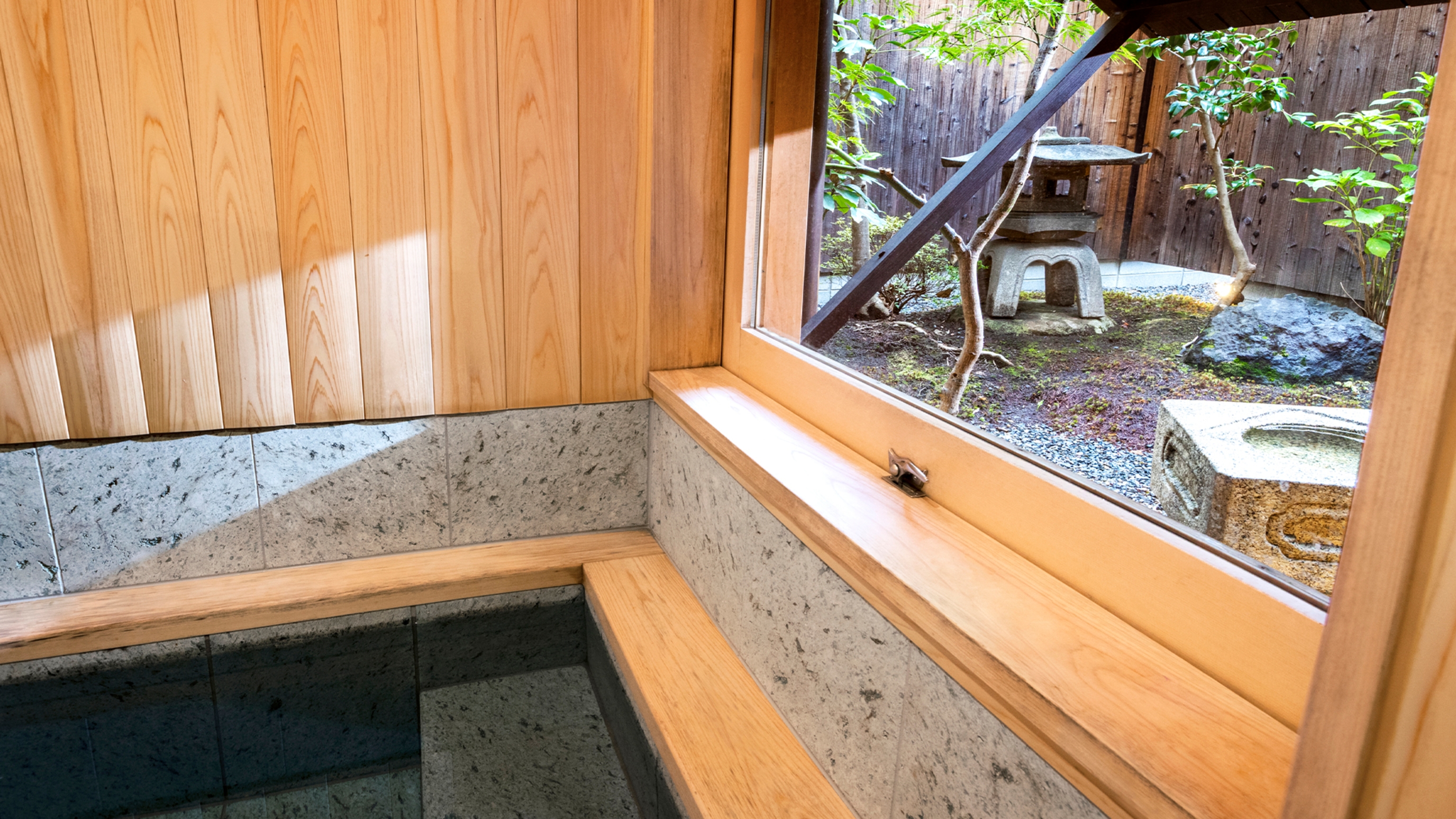 居室には石と木を組み合わせた上品な雰囲気の浴場、ワイドな窓からは外の庭と庭木が見えます。