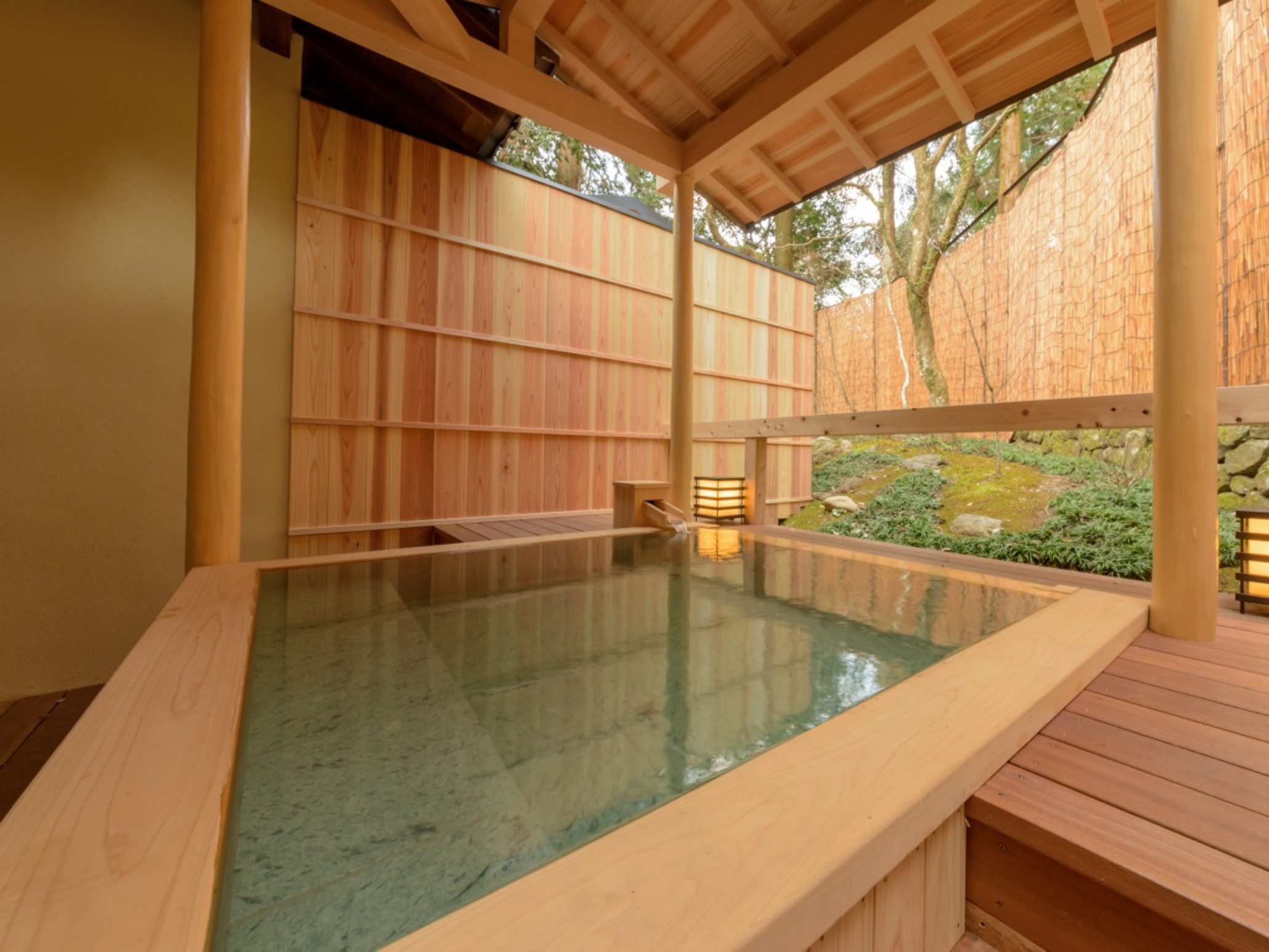 半露天庭園風呂、パテオ半露天風呂があり、温かみのある木製浴槽、広さや景観なども客室によってバリエーション豊かな露天風呂が揃い、どれもラグジュアリーな空間と贅沢な時間が体験できそうです。