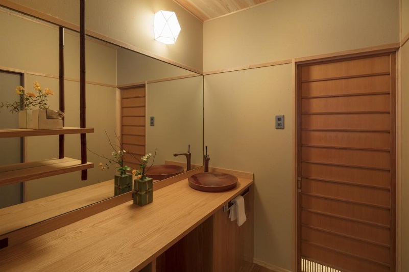 洗面所は美しい木目を基調としていて、最大8名で宿泊しても不便がない大きな鏡があり。