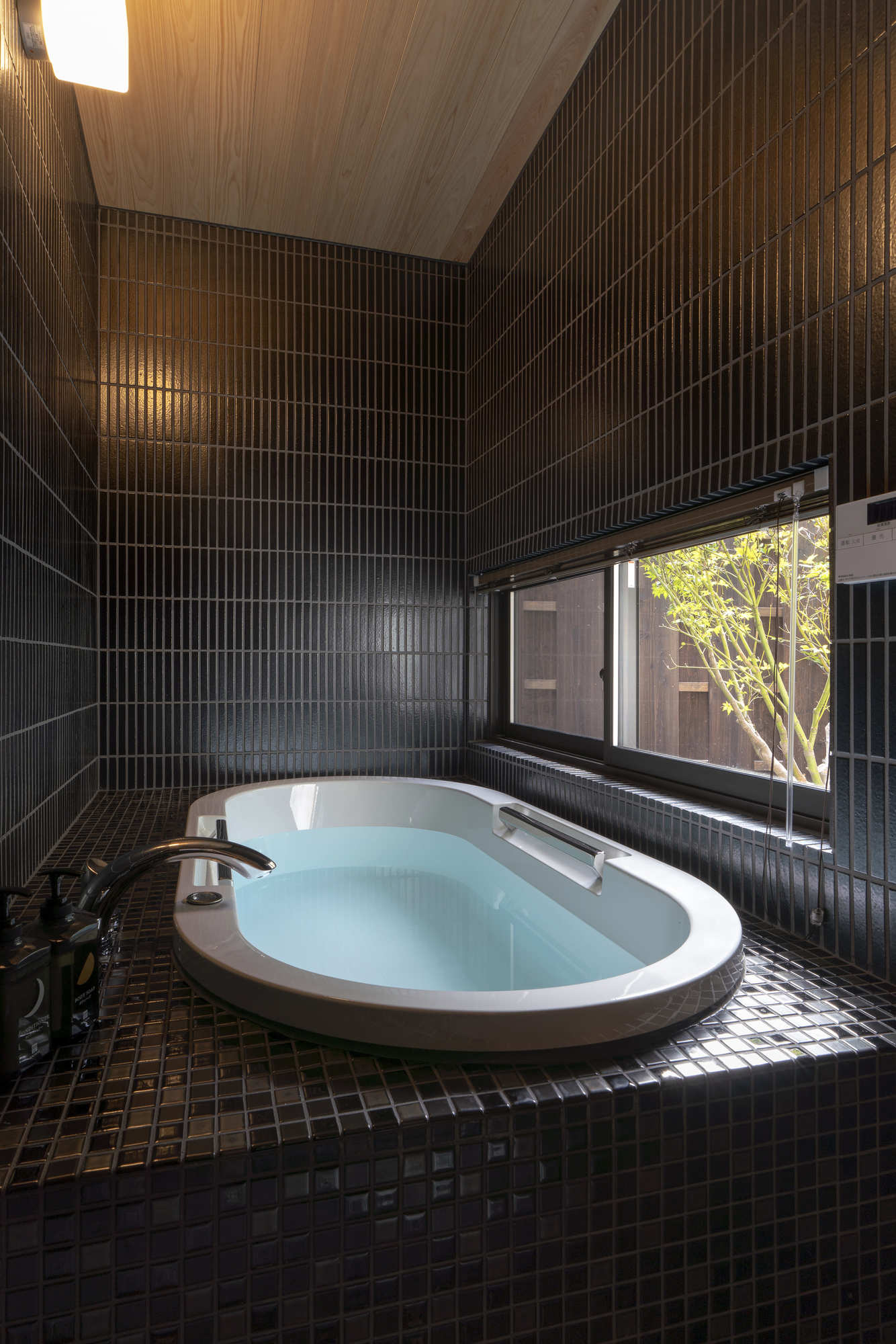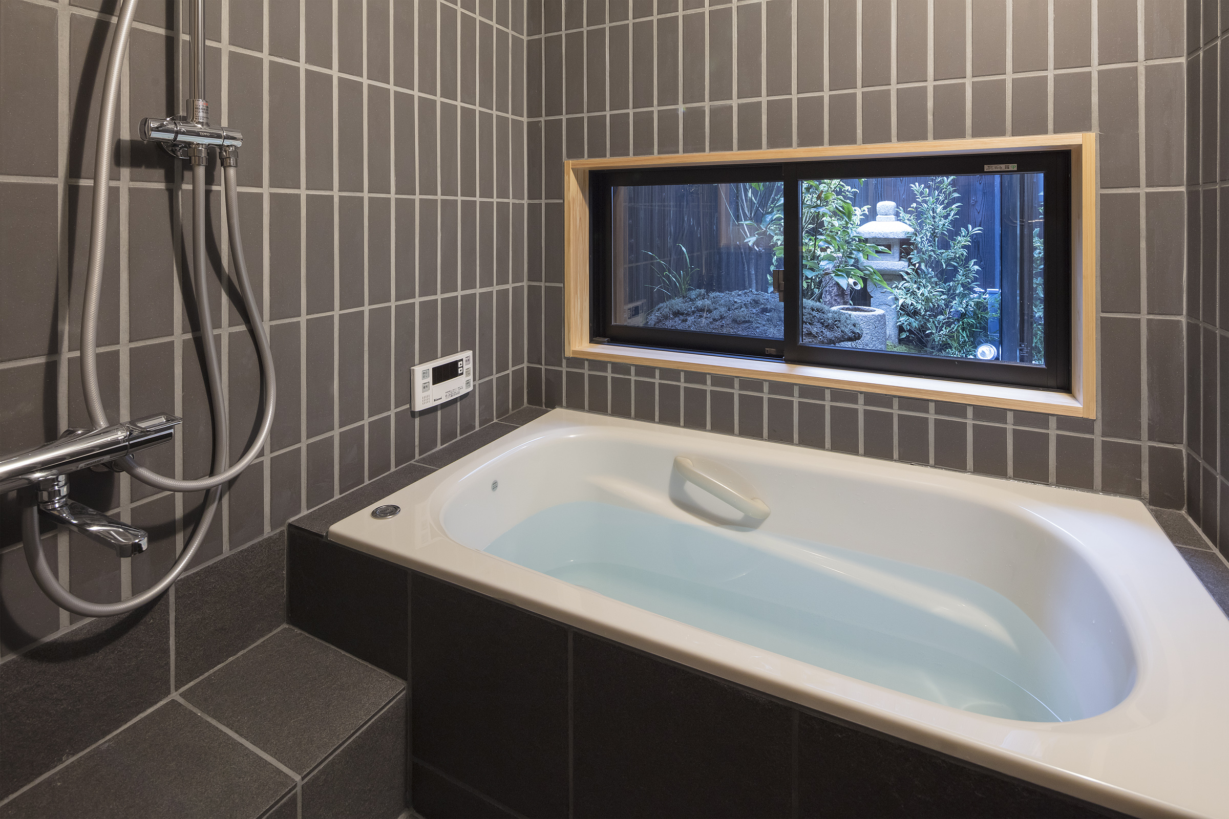浴槽のタイルも清々しいお風呂からは、可愛らしい坪庭を眺めることも。