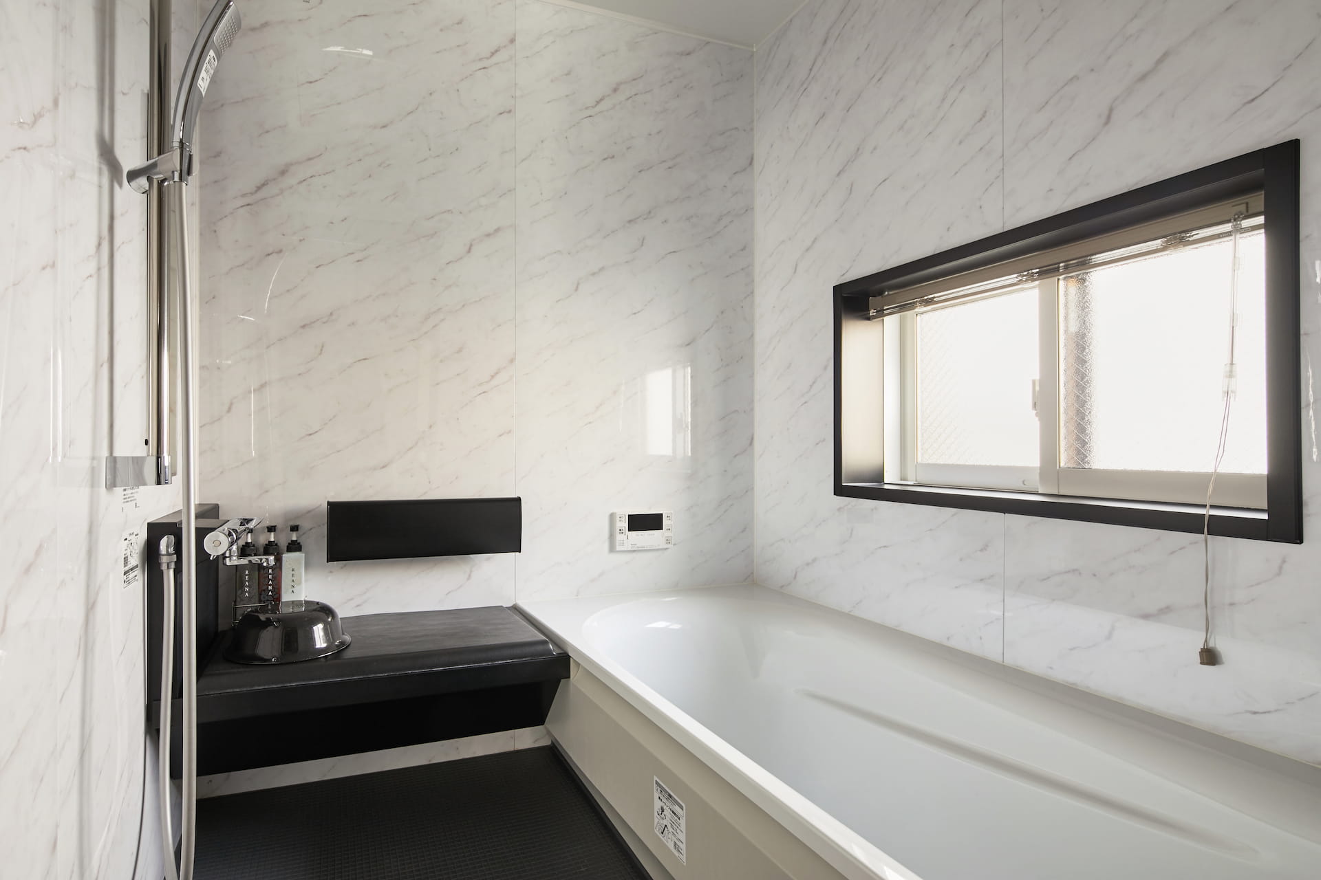 坪庭が望める浴室も、癒し効果が期待できそう。