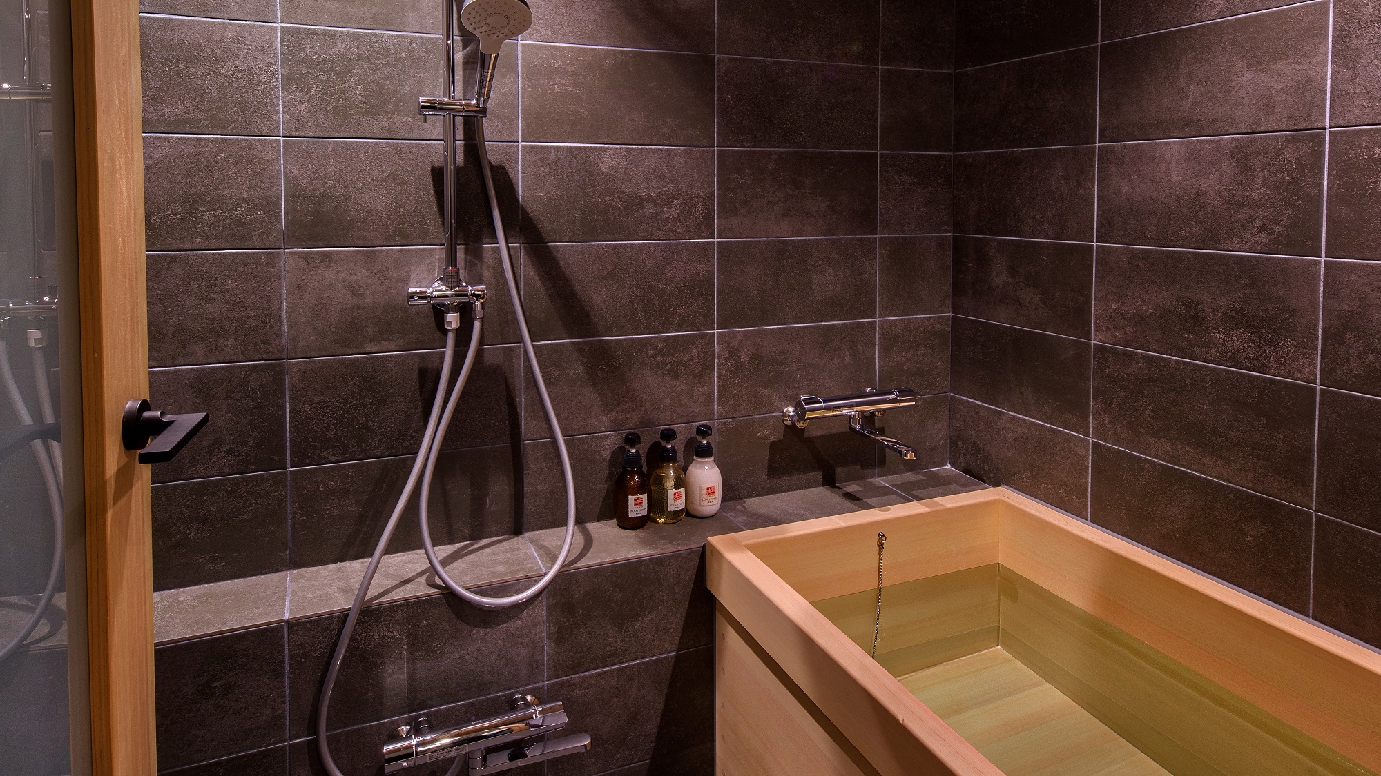 シンプルなインテリアのこの宿、浴室は高級旅館のような重厚感があります。