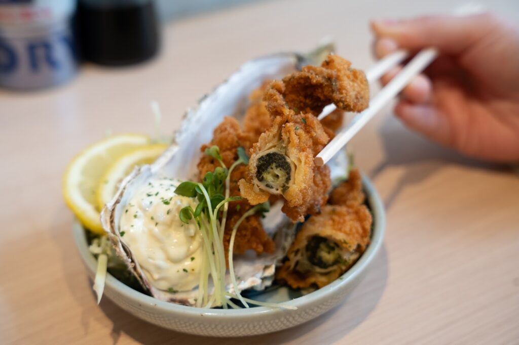 タレをつけてもいいけれど、あえて何もつけず、牡蠣の濃厚な旨みとアクセントの大葉のマリアージュをダイレクトに堪能するのもおすすめです。