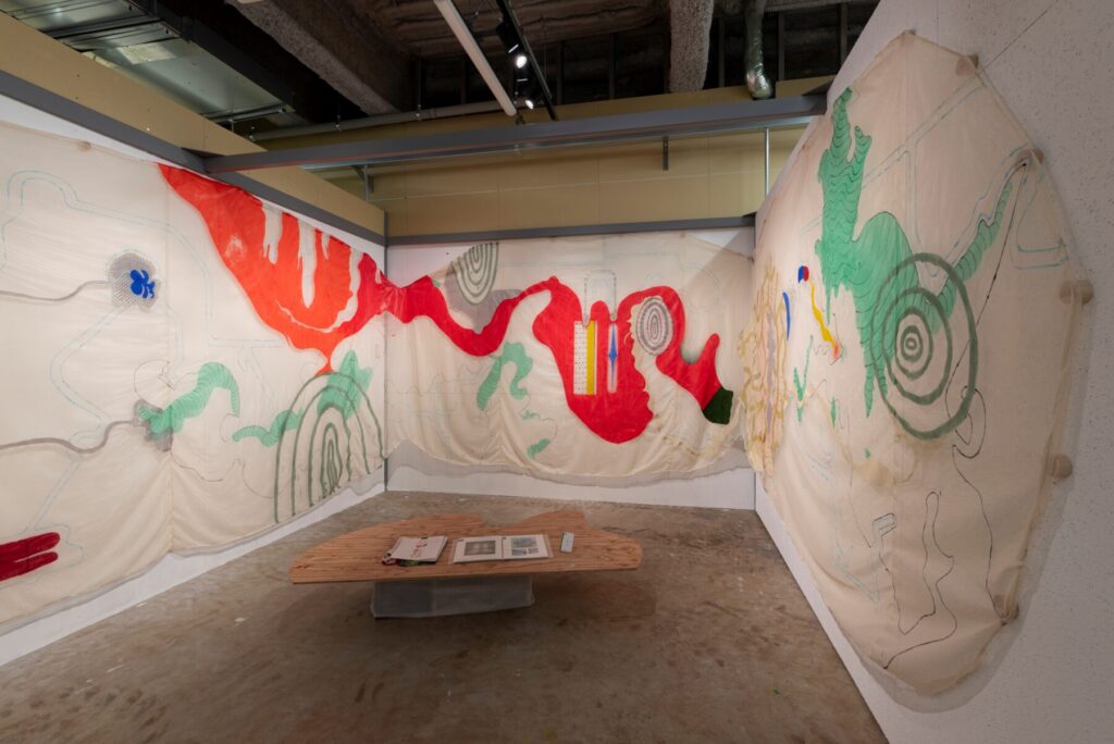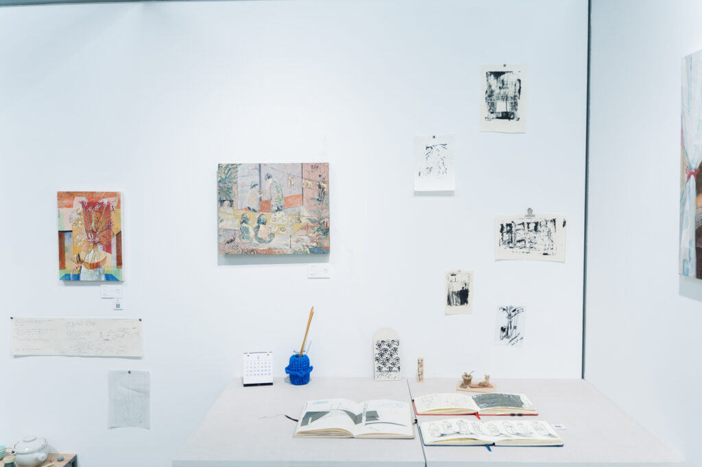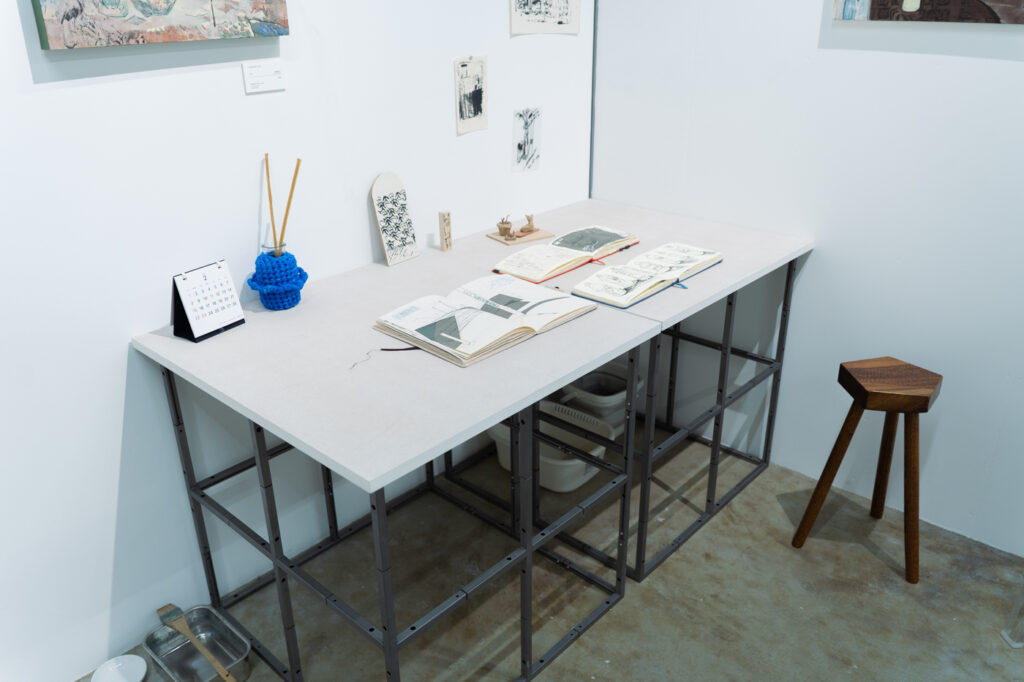 スペースには自身のスケッチブックを置き、来場者は自由にのぞくことができるのも、アトリエ兼展示スペースという面白さを表現。