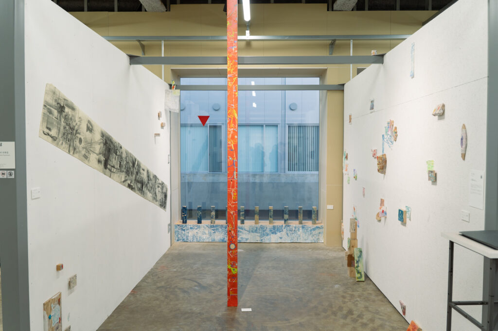 会場となるTERRADA ART STUDIO 京都(京都市立芸術大学A棟6階)は、展示専用のギャラリーではなく、実際にアーティストが制作拠点として使用するスタジオ空間です。